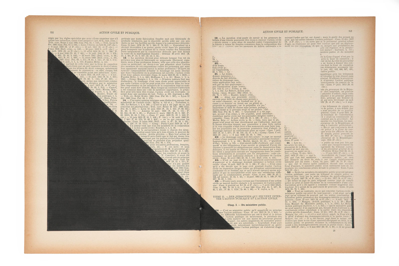 The book from which most of the pages are taken for the Pars Par Toto series is a French legal dictionary that was used by students who wanted to be lawyers or judges in France. It dates from 1889. To give you some perspective that is also the year that the Eiffel tower was opened so it’s quite old, it’s 130 years old now. It used to belong to my sister, Evelyn who was two years younger than me. She passed away suddenly at 35 in 2013 from a massive heart attack. It’s a very strange feeling when you inherit stuff from your younger sister. We were walking through her house and, you know, you have to empty the place- it was going to be sold. One of the items that I kept was that book, not knowing what was in the book, but just because my sister was also someone who used to frequent the flea markets a lot so we had that similar interest in older and decaying things. There was a series of books on the coffee table and that was one of them. It was the biggest one on the bottom and we never opened it, we just used it as a beautiful item in itself, as an object. It took me years to muster up the courage. In 2020 I first opened it and saw that it was all about justice.